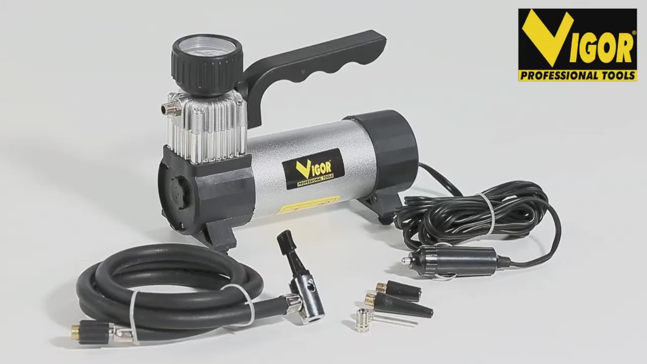 MINICOMPRESSORI VIGOR VMC-19 - CORPO ACCIAIO SENZA SERBATOIO - 12 V 10 A, PRESSIONE MAX 5 BAR - ARIA ASPIRATA MAX 19 L/MIN - TUBO ARIA 1 M, 3 UGELLI - CAVO PER ACCENDISIGARI